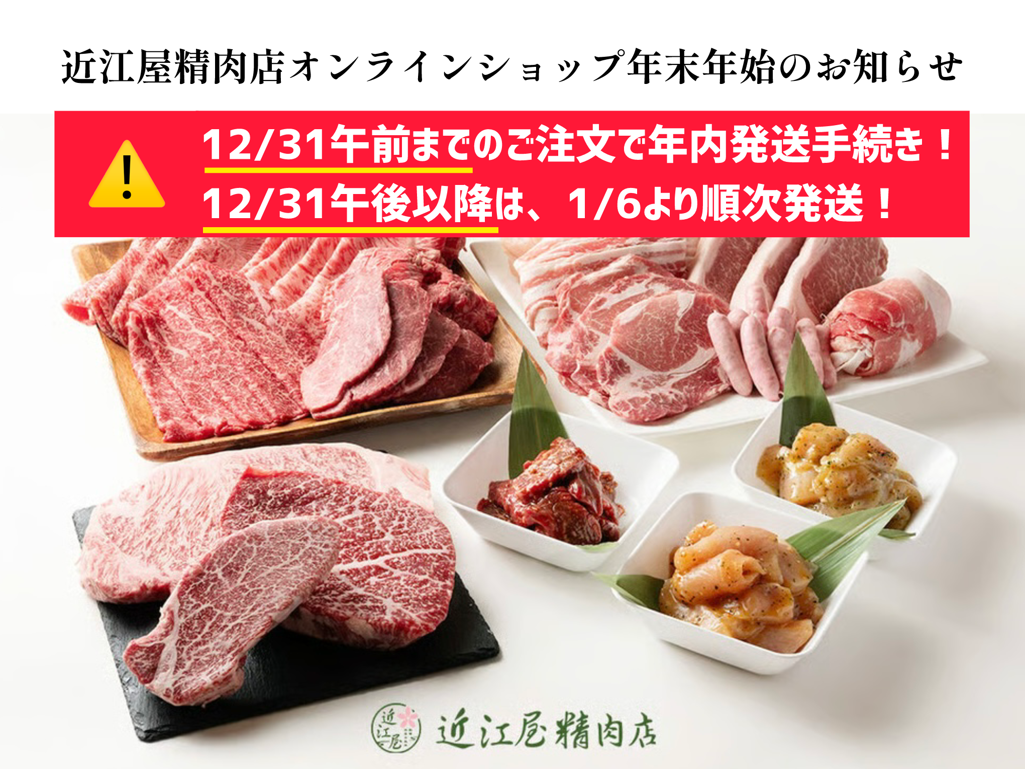近江屋精肉店オンラインストア🌸年末年始の営業について 2025.12.27お知らせ 2025年は12月31日まで営業しておりますが、 オンラインストアは12/31午前までのご注文で、年内発送手続きをさせていただきます。 12/31午後以降のご注文は、1/6より順次発送となります。 2026年1月1日〜5日まで、年始休業となります。 ご不便をおかけいたしますが、何卒ご理解のほどお願い申し上げます。 ◀︎ お知らせ一覧へ カテゴリー 全記事 お知らせ レシピ チラシ お買得情報 営業日カレンダー